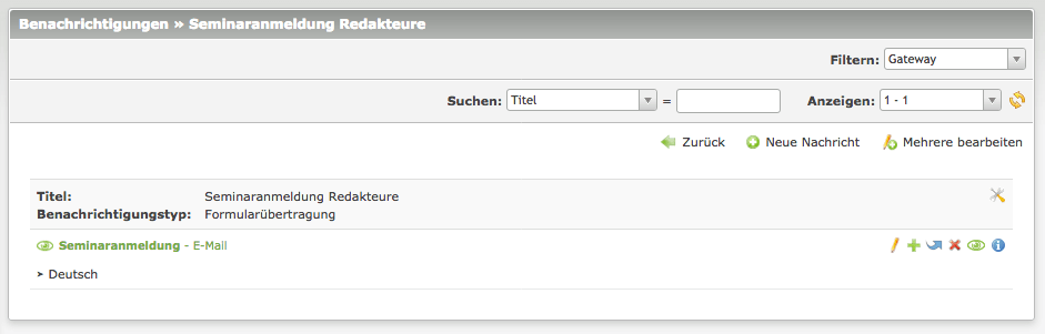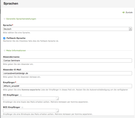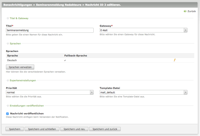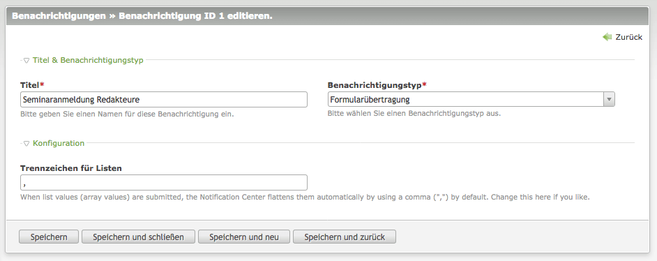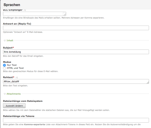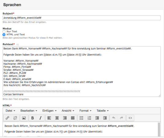Hinweis: Im Gegensatz zur Bestätigungsmail im Notification Center wird hier nur der Feldname innerhalb der zwei Rauten am Anfang und Ende eingesetzt.