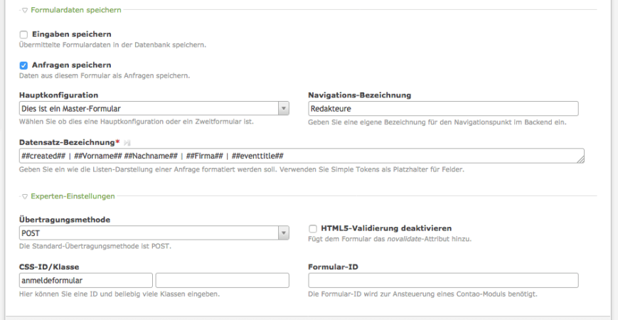Im Feld „Datensatz-Bezeichnung” können mit Simple Tokens Werte aus dem Datensatz ausgegeben werden. ##created## gibt das Datum und die Uhrzeit aus, an dem das Formular abgesendet wurde. Hilfreich um in der Auflistung einen schnellen Überblick zu bekommen.